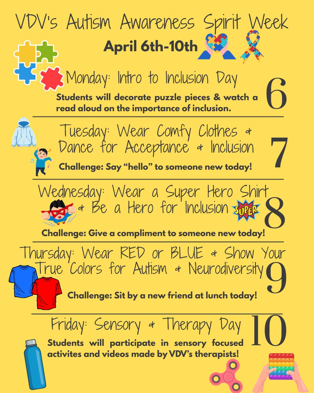 Join us for a Spirit Week celebrating Autism Awareness! Tuesday, 4/7 Wear comfy clothes Wednesday, 4/8 Wear a Superhero shirt Thursday, 4/9 Wear Red or Blue |