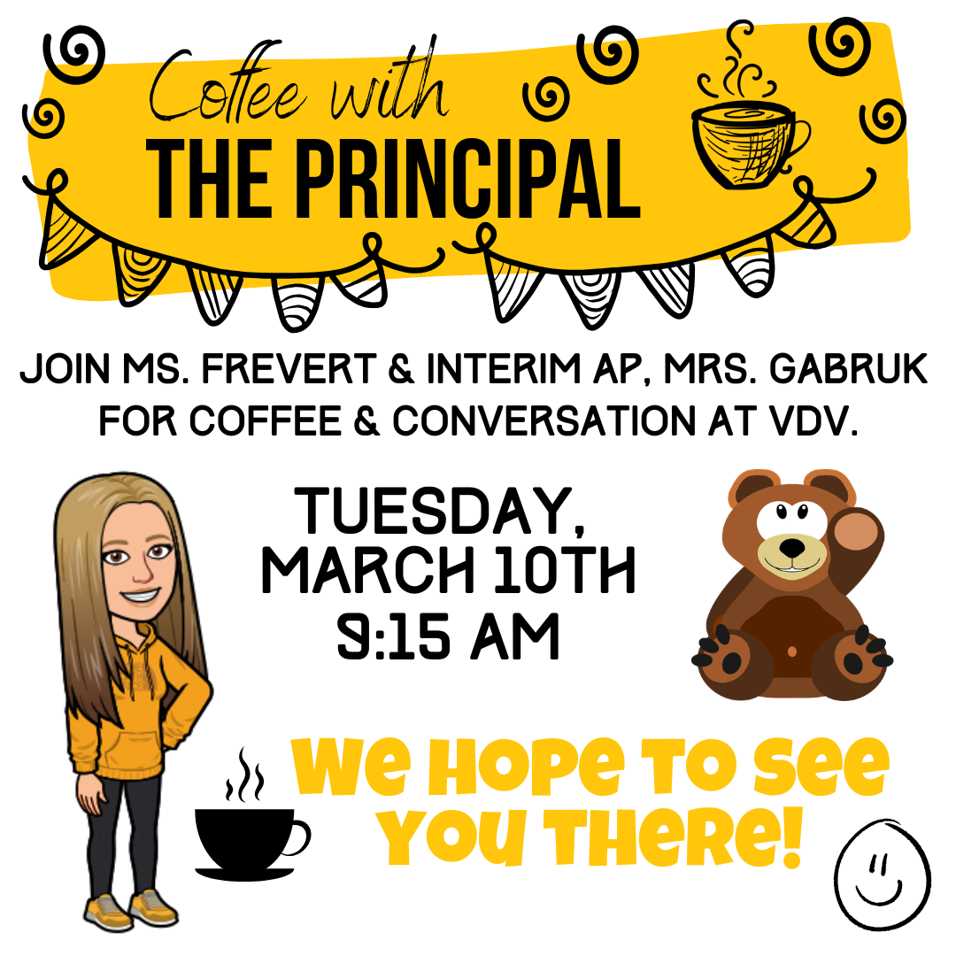 Join Ms. Frevert & Interim AP, Mrs Gabruk for Coffee & Conversation at VDV, Thursday March 10 at 9:15AM. |