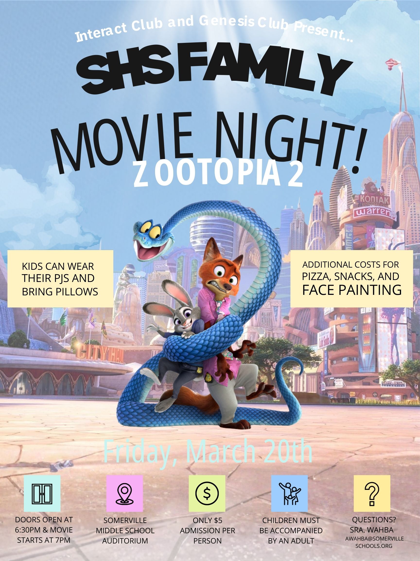The Somerville High School Genesis and Interact Club members will be hosting their Spring Family Community Movie Night on Friday, March 20, 2026, at 7:00 pm in the Somerville Middle School Auditorium again. The movie this year is Zootopia 2! |