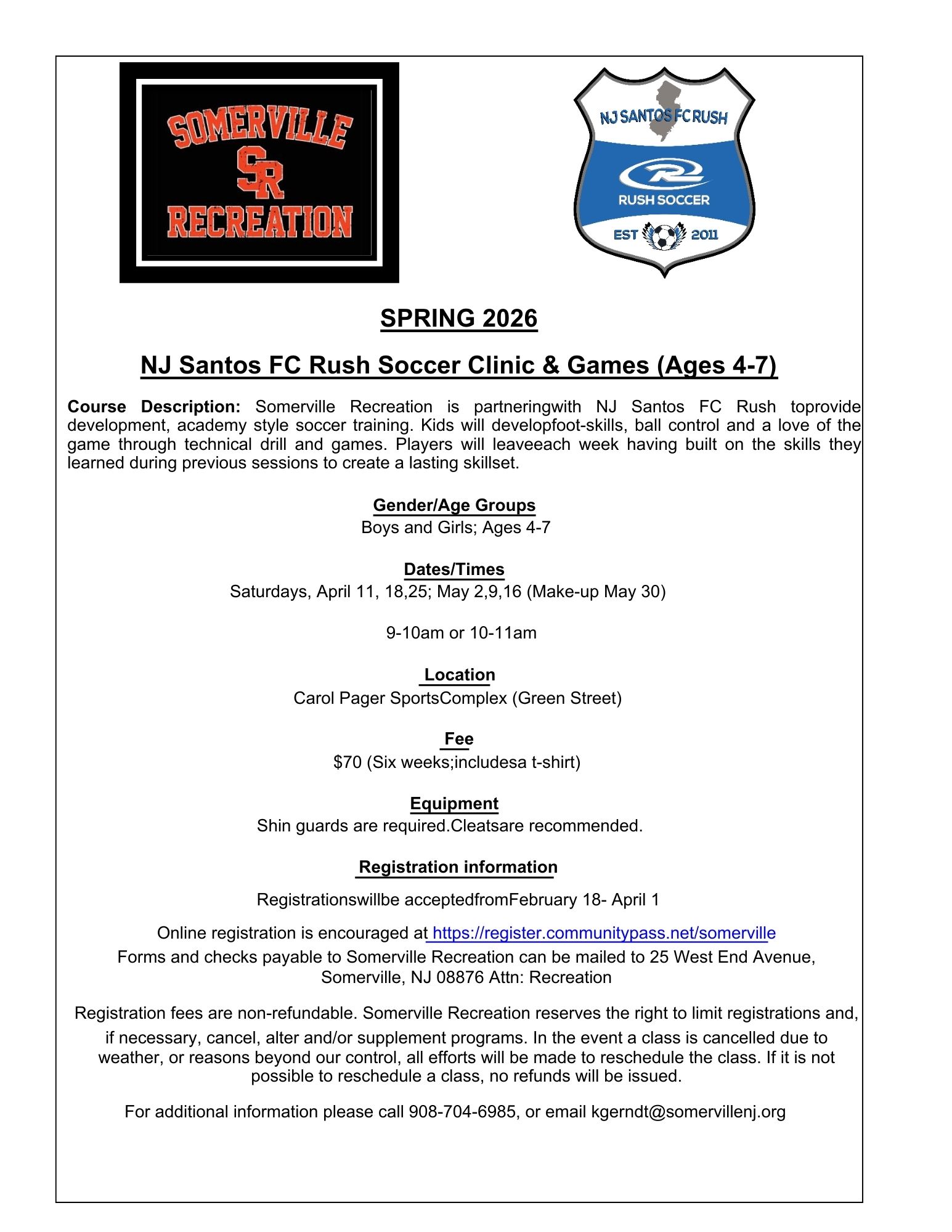 Spring 2026 Somerville Recreation Soccer Clinic Online registration is encouraged at https://register.communitypass.net/somerville Forms and checks payable to Somerville Recreation can be mailed to 25 West End Avenue, Somerville, NJ 08876 Attn: Recreation |