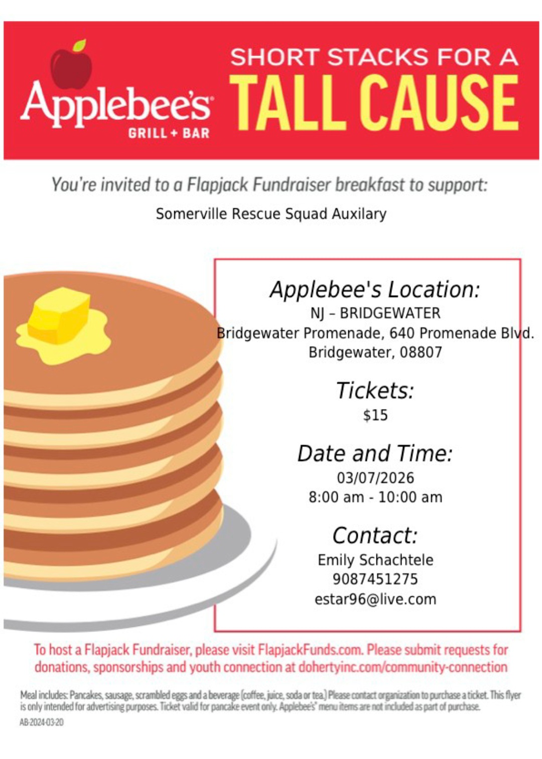 | You're invited to a Flapjack Fundraiser breakfast to support the Somerville Rescue Squad Auxiliary, 3/7 at Applebee's in Bridgewater. Call 908-745-1275 for information. |