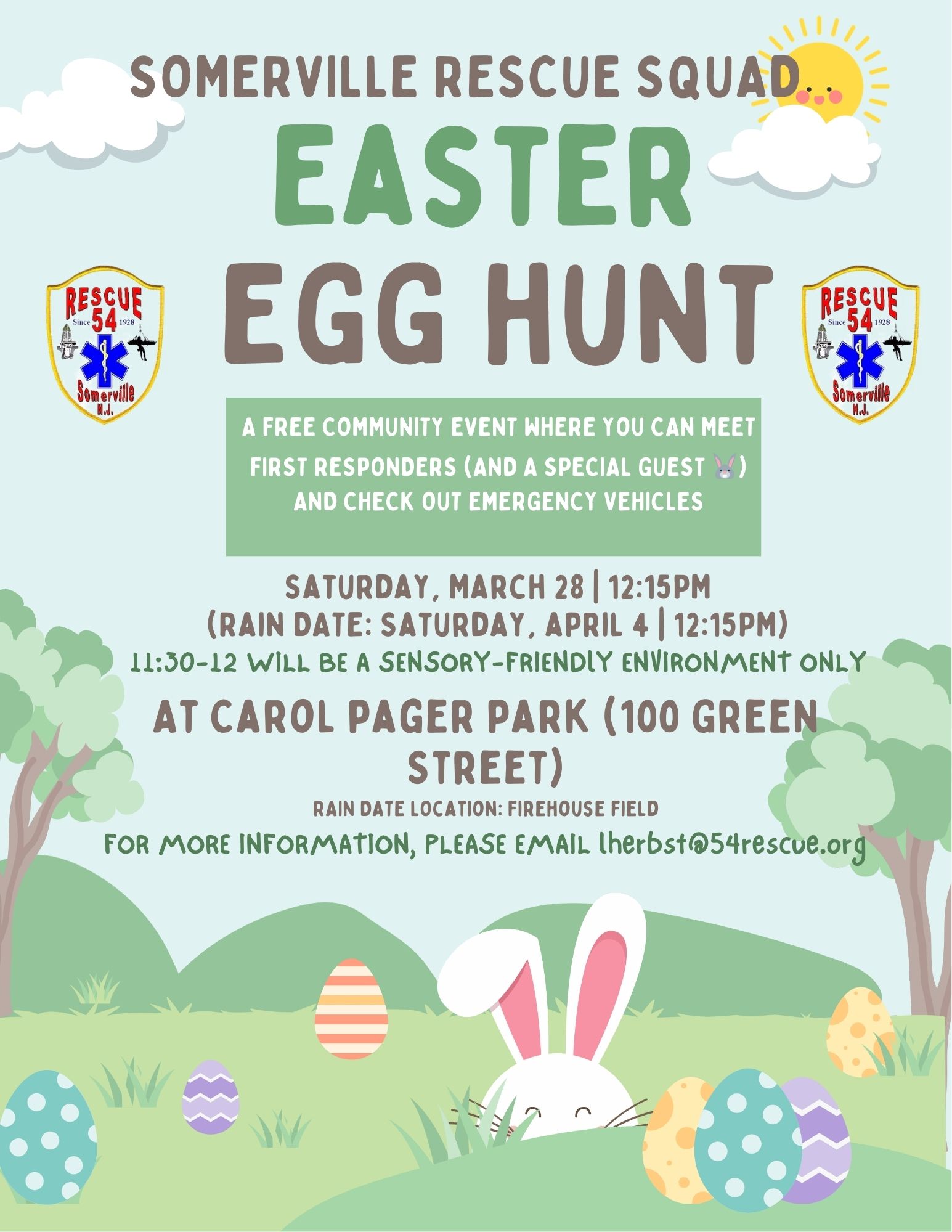 Somerville Rescue Squads Easter Egg Hunt, Saturday 3/28. This is a free community event! Email lherbst@54rescue.org for more information. |