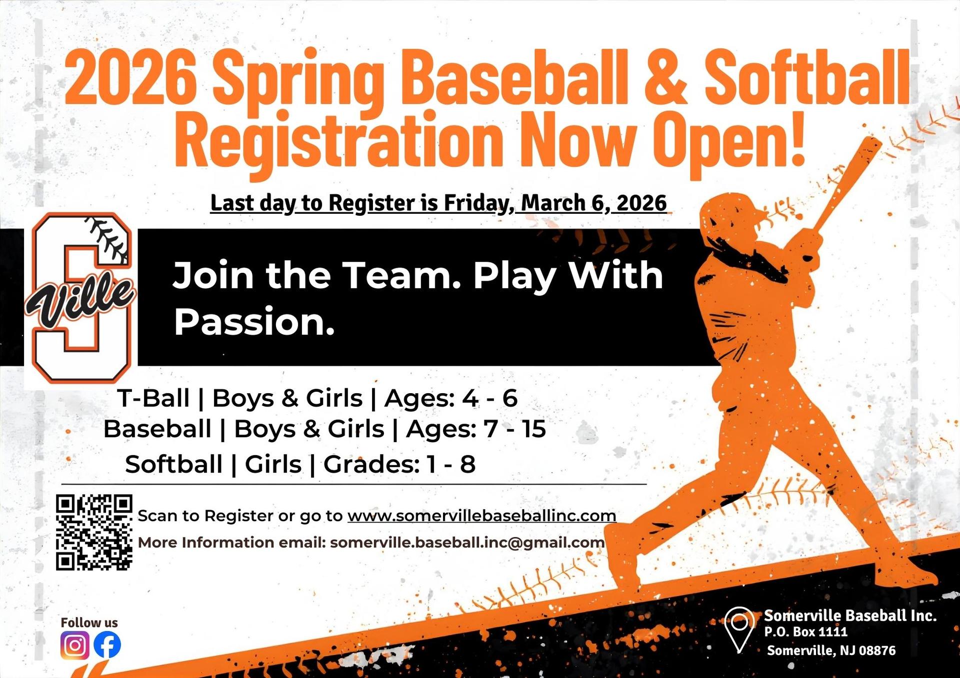 Last day to register for the 2026 Spring Baseball & Softball season! Scan the QR Code above to register. |