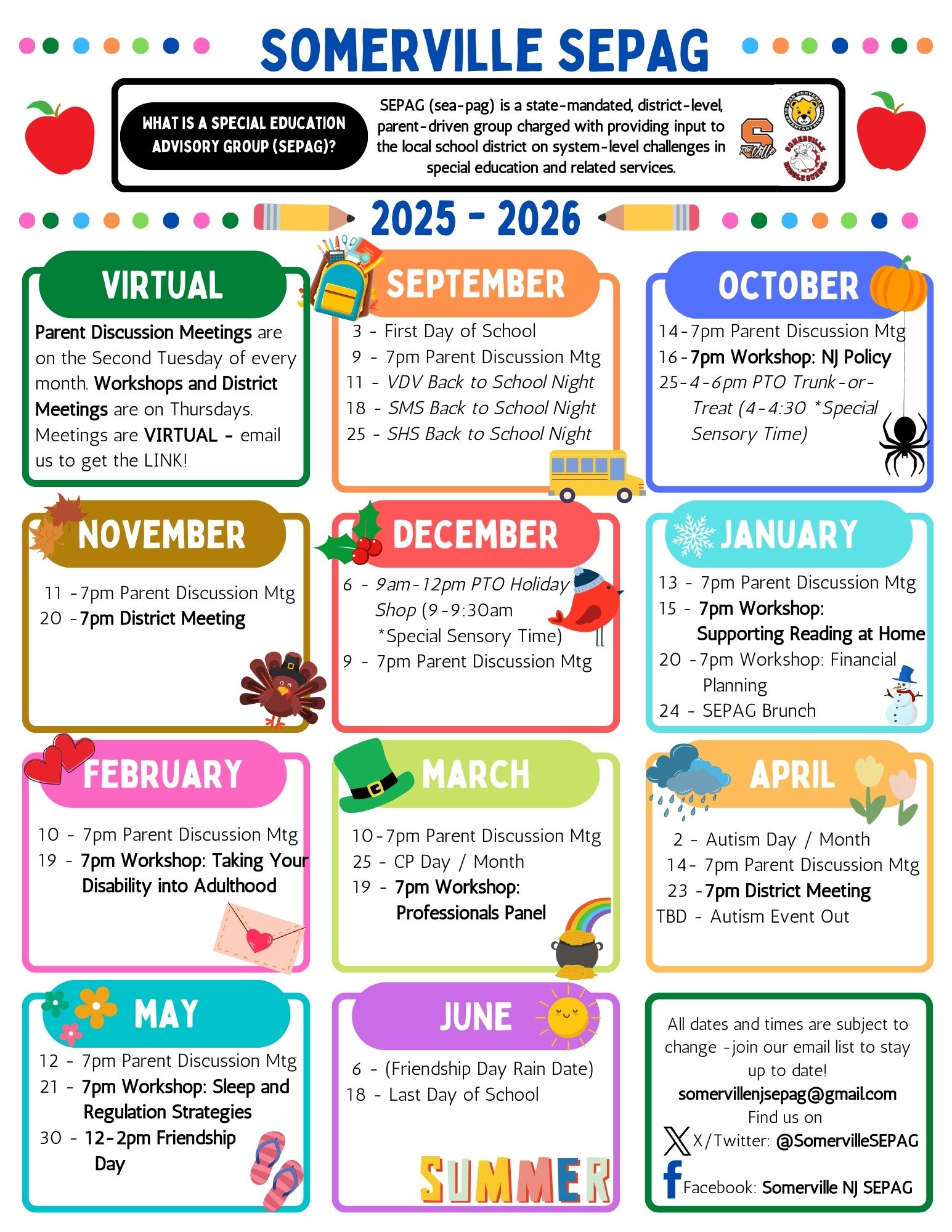 The SEPAG works collaboratively with CST and district administration to identify trends, share parent perspectives, and support continuous improvement in special education services across all Somerville schools, including Van Derveer Elementary School, Somerville Middle School, Somerville High School, and out-of-district placements. |