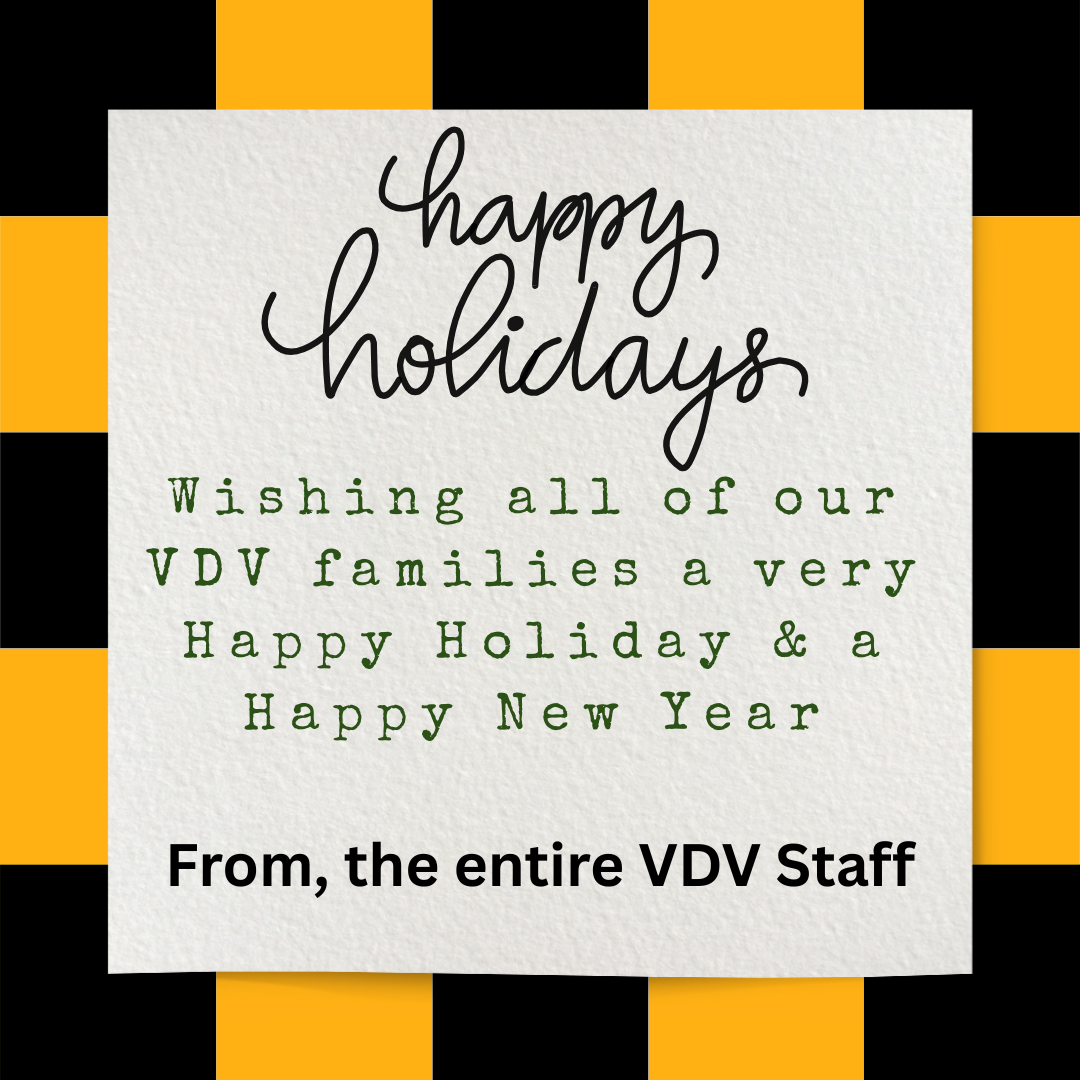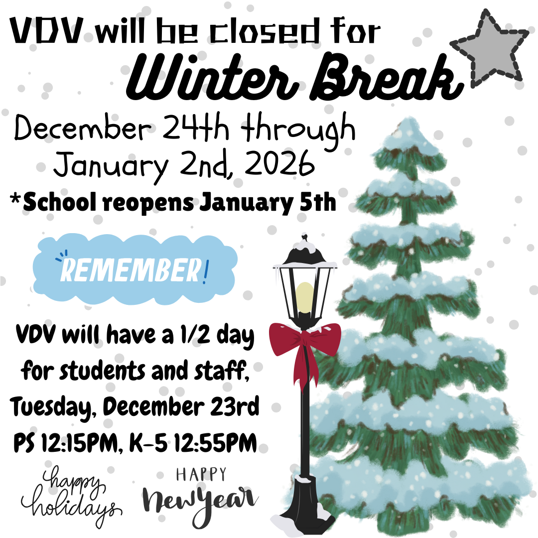 REMINDER...December 8th - 12th will be half days for ALL VDV students, due to Parent/Teacher Conferences. Preschool will dismiss at 12:15PM, K-5 will dismiss at 12:55PM. Lunch served for PS/KG/MD/ABA/LLD classes ONLY. |