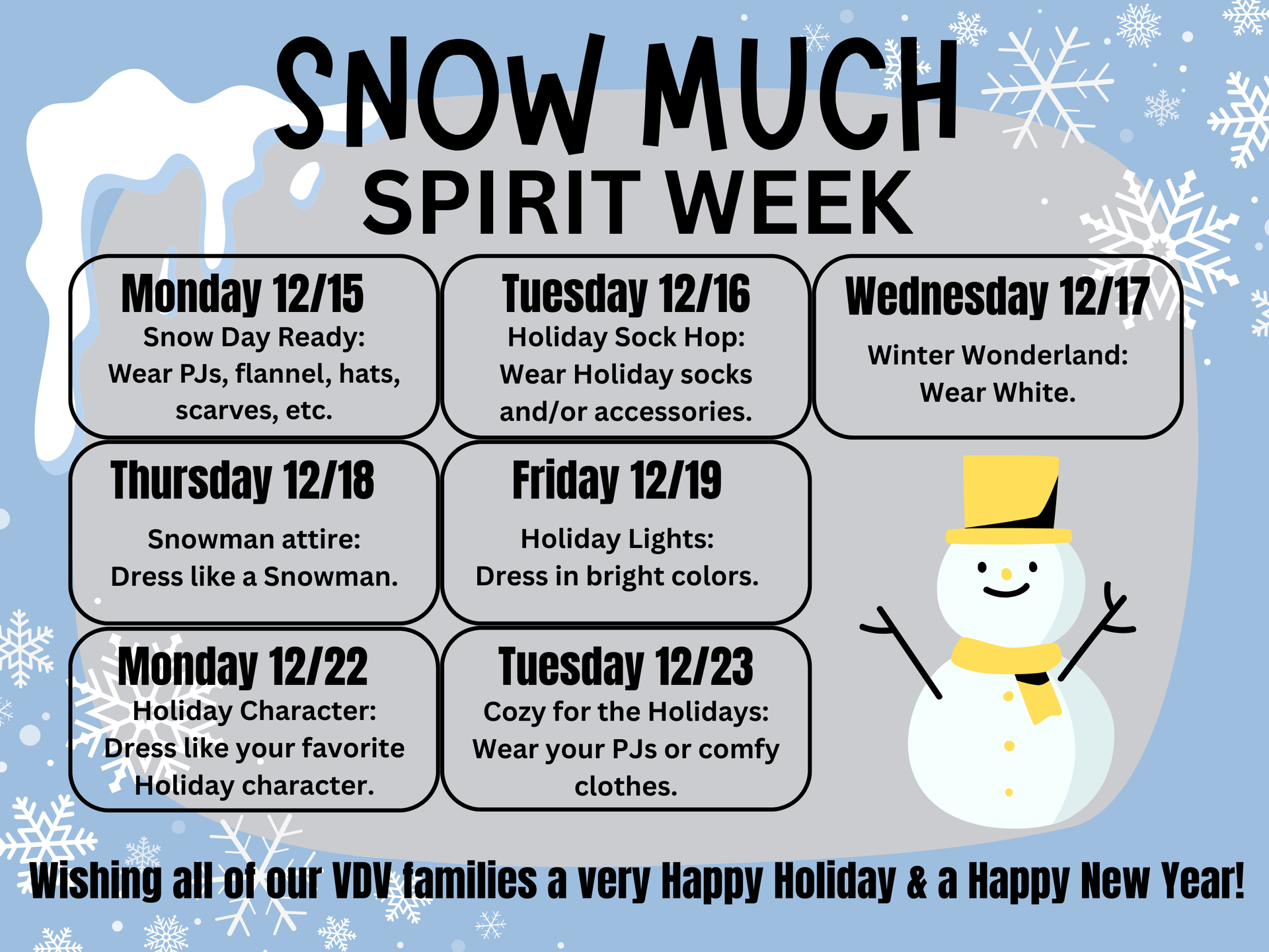 Monday, 12/15 Snow Day Ready: Wear PJs, flannel, hats, scarves, etc. Tuesday, 12/16 Holiday Sock Hop: Wear holiday socks and/or accessories. Wednesday, 12/17 Winter Wonderland: Wear White. Thursday, 12/18 Snowman attire: Dress like a Snowman. Friday, 12/19 Holiday Lights: Dress in bright colors. Monday, 12/22 Holiday Character: Dress like your favorite Holiday character. Tuesday, 12/23 Cozy for the Holidays: Wear PJs or comfy clothes. |
