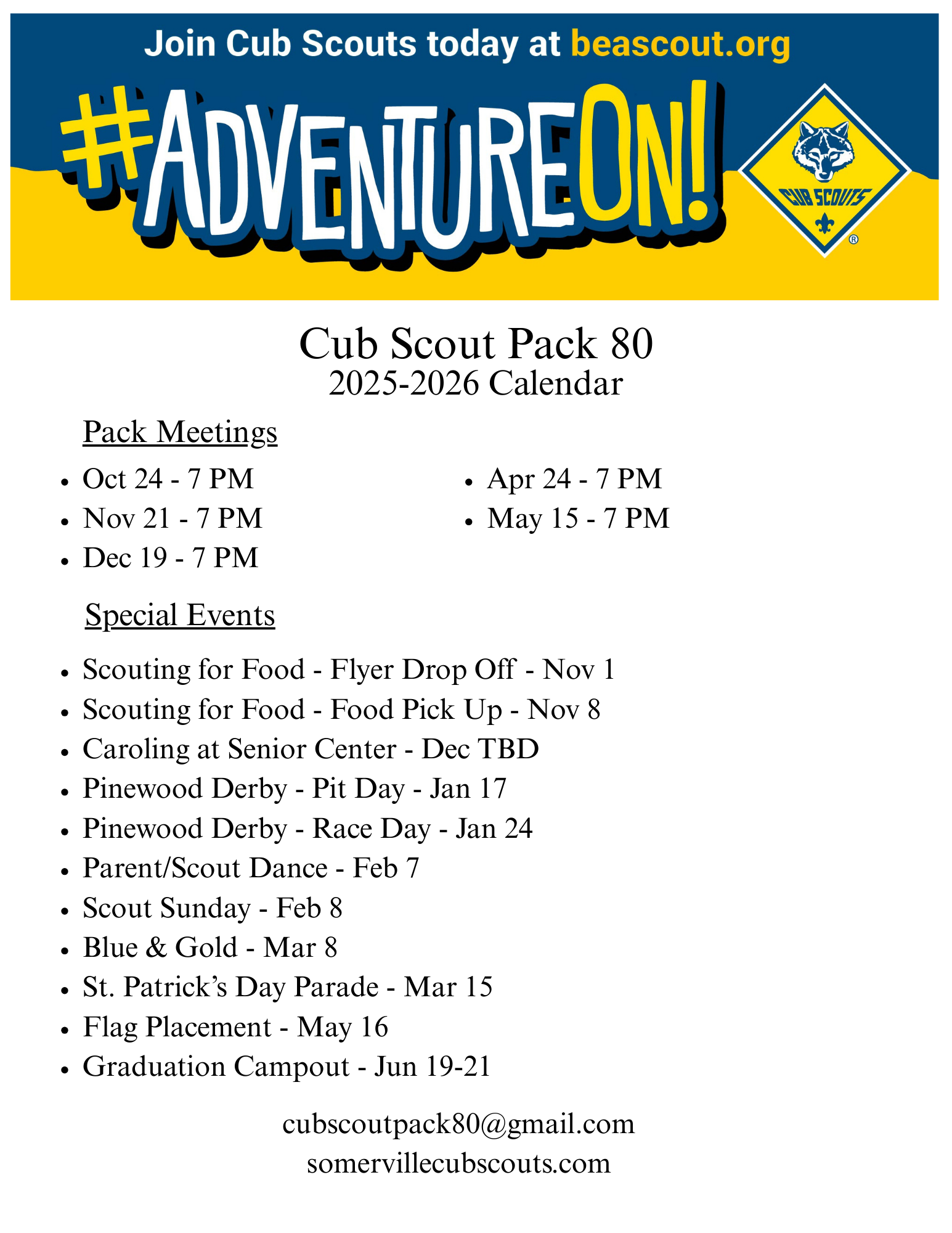 Come discover Cub Scout Pack 80, where fun, friendship, and adventure await your child! Contact CubScoutPack80@gmail.com for more info! |