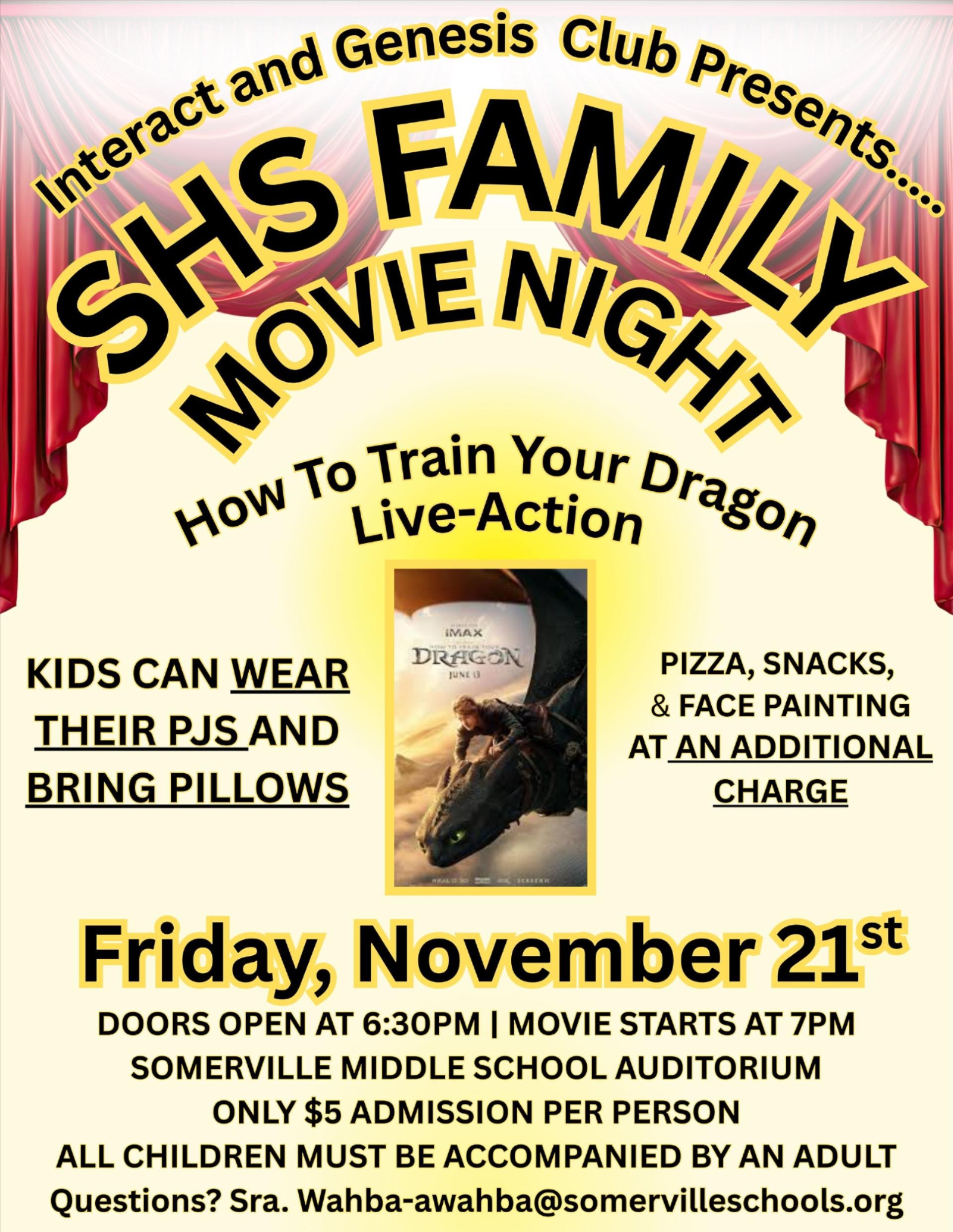 Somerville High School Genesis and Interact Club members will be hosting our Fall Family Community Movie Night on Friday, November 21, 2025, at 7:00 pm in the Somerville Middle School Auditorium. |
